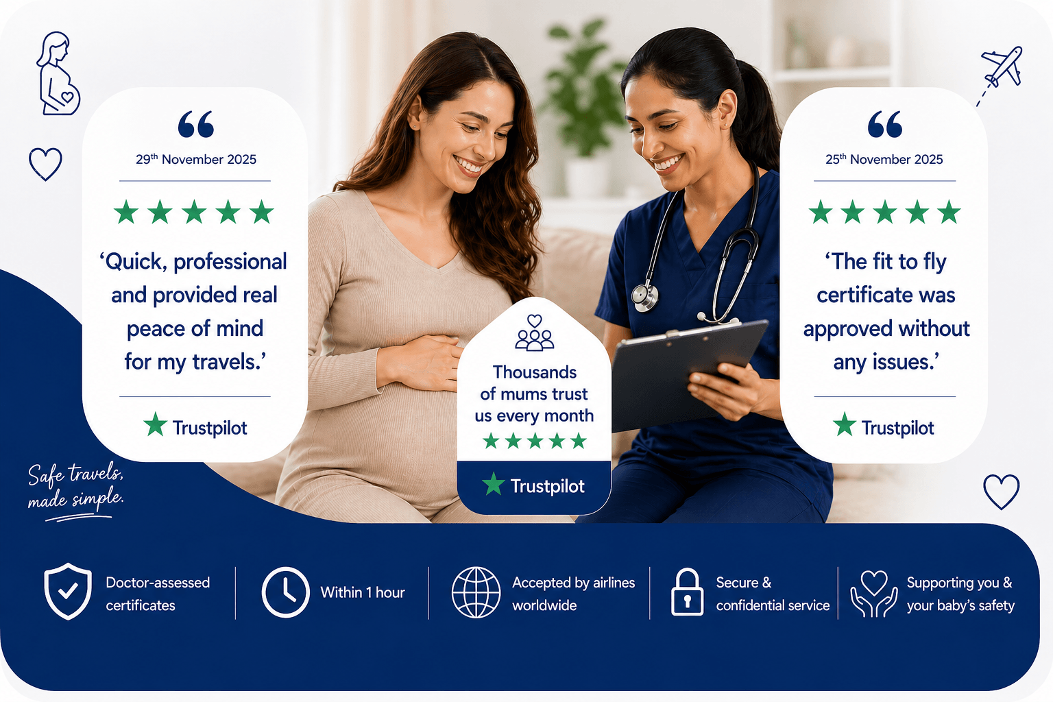 Our team of UK Doctors provide over 30,000 medical certificates every year. Our pregnancy fitness to fly certificate is accepted by every airline. Most airliens do not require any additonal airline specific form to be completed - zoomdoc are accepted. We are proud to be trusted, regulated and secure.